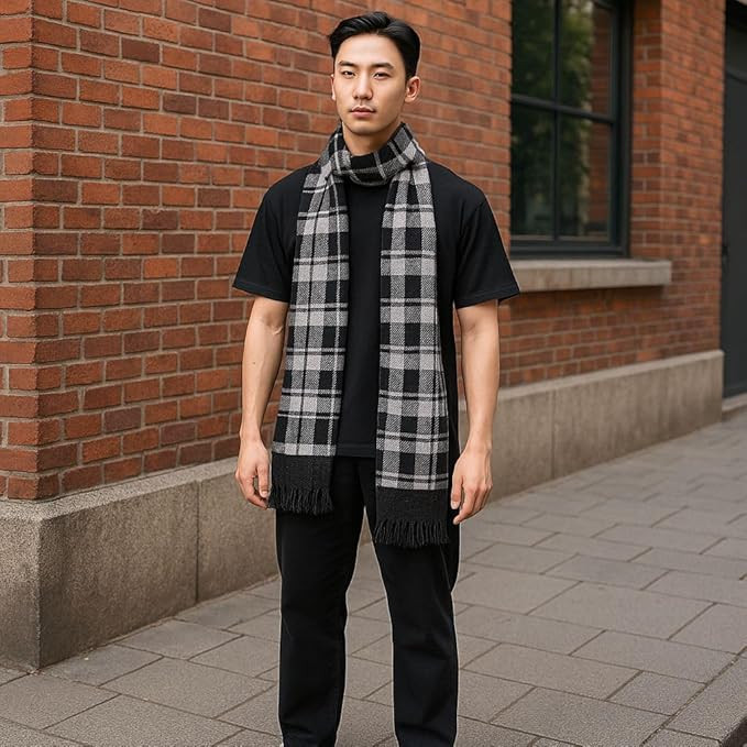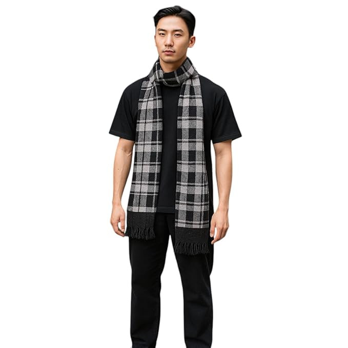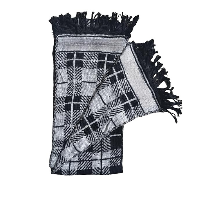 Stay warm and fashionable this winter with our premium woollen muffler. Crafted from a blend of soft, high-quality wool, this scarf offers ultimate comfort and insulation against the chill. Whether you're braving the chilly outdoors or simply looking to add a touch of sophistication to your ensemble, this muffler is the perfect accessory. Featuring a striking chevron pattern in contrasting shades of black and grey, it adds a stylish flair to any outfit. With fringed ends for a classic touch, this versatile muffler can be effortlessly styled in numerous ways. Wrap it around your neck for a cosy feel or drape it over your shoulders for a chic layered look. Measuring 180 cm in length and 30 cm in width, it provides ample coverage without being too bulky. Lightweight yet warm, this muffler is a must-have for the winter season.