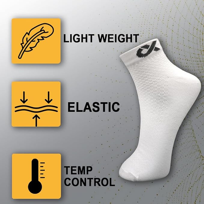 DURABLE: Pack of 3 pairs Multiple colors are available for ankle socks (Black, White & Grey socks). All feet fall into the same size between 7 and 11. Included are three sets of cotton ankle socks for men and women that are odor-resistant and have breathable mesh on top of the foot. A remarkably soft and quickly absorbs sweat while keeping your feet dry and protecting them from harm. VERSATILE: Fit For Gym, Casual Wear & Running Our athletic ankle socks are made to be used on a regular basis and improve your performance whether you're doing yoga & gym, cycling, running, walking, standing, travelling, or simply relaxing on the couch. The athletic ankle socks have excellent recovery and stretch. These athletic ankle socks won't break easily, So you may use them for a long time without worrying. STAY COOL: Our long-fiber cotton knitting technique makes our multicolor socks for men and women light and breathable, Allowing your feet to breathe easily whether exercising or jogging. For long-lasting protection and a soft landing with each step. The cool comfort fabric absorbs away sweat, keeping your feet cool and dry during the entire day. GOOD COMFORT: Sports Socks for further protection and comfort in high-wear areas, these men and women socks have soft around the ankle. Ankle socks for men and golf socks also provide stability for a proper fit and an arch that is suited to protect you as you walk, jog and run. EVERY SEASON: Our men's athletic unisex sports socks are neither too thick nor too thin, keeping you warm in the winter and cool in the summer. Our unisex cotton socks are expertly designed for various sports, including tennis, marathons, golf, cycling, trekking, and mountain climbing. Simple socks can be used with any everyday outfit by adults and teenagers.