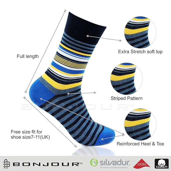 Bonjour men's Multi-Pack Socks with different design, pattern and colour to fulfil your various needs in one pack These Socks club well to compliment your dressing for any purpose like going out for party picnic, in office, or in a club These Bonjour Casual Socks are crafted using extremely soft Cotton and Lycra blend Fabric, Your feet Relax in these super soft Socks from Bonjour