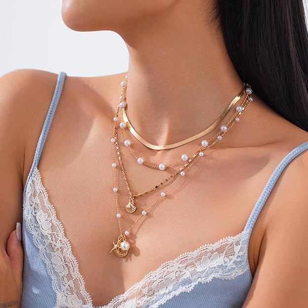 OCEAN-INSPIRED NECKLACE COMBO: Necklace set features a stunning collection of four layered necklaces, each adorned with charming ocean motifs like starfish and seashells. The carefully chosen pendants evoke the serene beauty of the beach, making them perfect for summer outings or adding a touch of aquatic elegance to everyday wear.