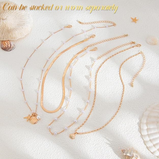 4Pcs Necklace for Women Girls Boho Gold Seashell Starfish Pendant Necklaces Layered Pearl Herringbone Necklace Chains Beach Jewelry Gift Item for Women
