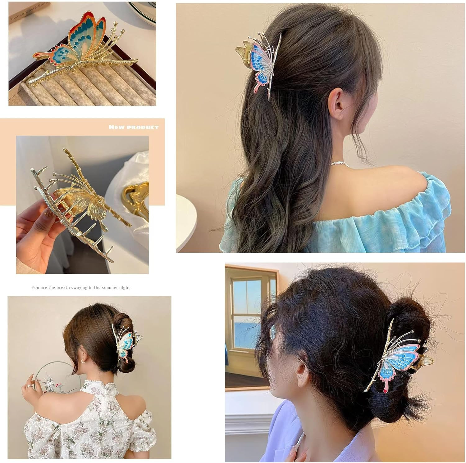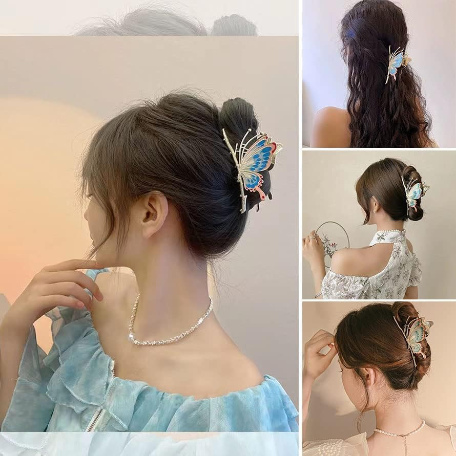 Rhinestone Golden Claw Clip, Embellished Korean Clutcher, Non- Slip Metal Claw Clip for Girls, Fancy Clutcher for Women, Pack of 1 (BLUE BUTTERFLY)
