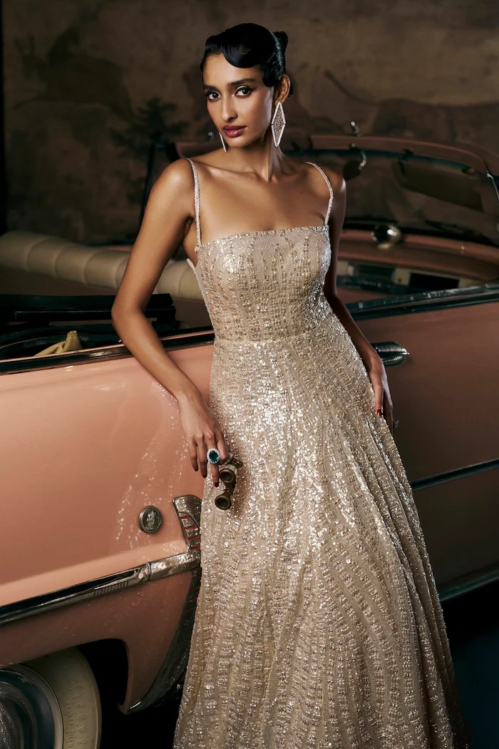 This gown features tonal sequin embroidery in a wave pattern on a champagne net base. The outfit comes with detachable straps and has a flowy flare silhouette.