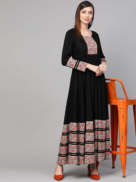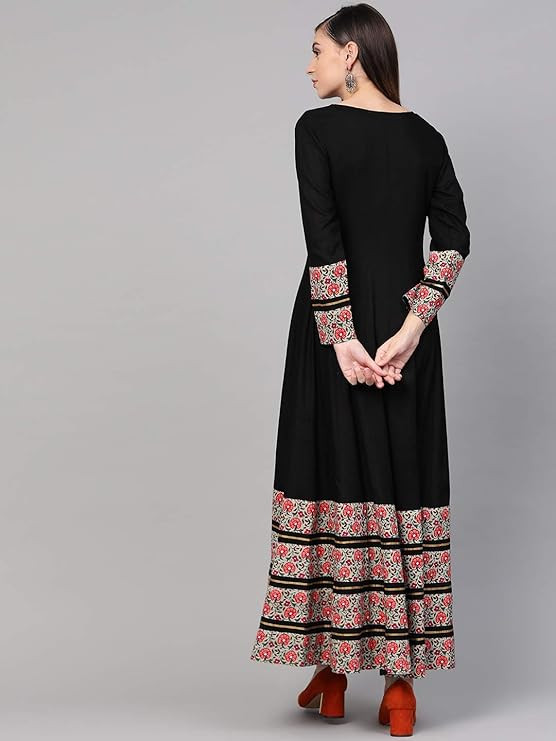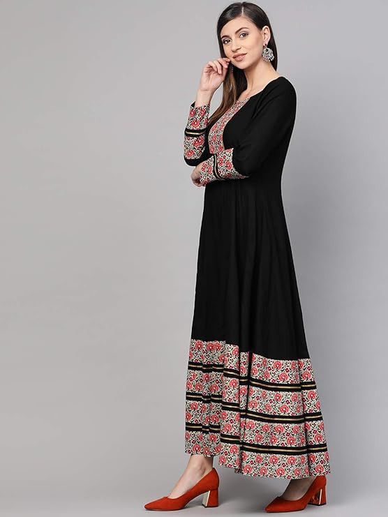 Elegant Design & Comfort - This Anarkali cotton dress features a stylish printed border and solid pattern, making it a good party wear Anarkali dress for women seeking a chic, festive look with the comfort of a breathable cotton top fabric. Versatile Occasions - Adorn this Anarkali dress pattern for various events, from festive celebrations to social gatherings, as it showcases a trendy cotton Anarkali dress that complements your traditional attire with a touch of modern elegance. Convenient Care Instructions - Preserve the beauty of this Anarkali dress by simply machine washing it in cold water separately; for optimal results, dry cleaning is recommended. Avoid bleaching, tumble dry low, and warm iron if needed. Flattering Fit & Features - With a round neck, full sleeves, and a floral Anarkali dress design, this garment instantly elevates your ethnic wardrobe. Its Anarkali dress online shopping option makes it easily accessible for fashion enthusiasts. Exquisite Craftsmanship - This black Anarkali dress with printed borders showcases excellent workmanship, ensuring you stand out in any party or festive event. Its intricate design and attention to detail make it a must- have for your collection.