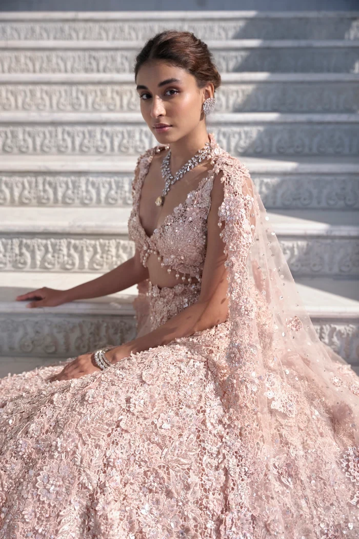 This lehenga set features heavy three-dimensional cut work embroidery in crystal, thread, pearl and sequin. The blouse shows cut work embroidery with delicate pearl tassels at the waist and 3D flowers at the back. It is paired with the heavily embroidered dupatta with floral motifs and pearl tassels all over.