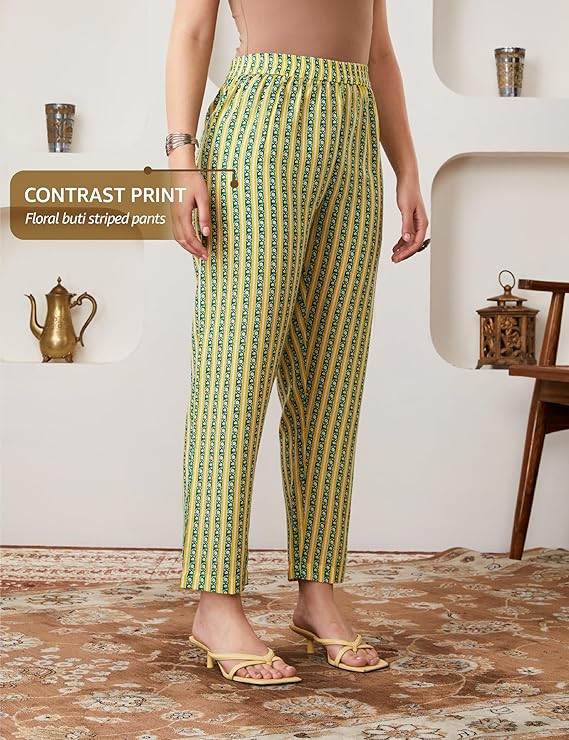 • Calf-length, V-neck kurta and 3/4th sleeves paired with an elasticated waist pyjama featuring a pocket.