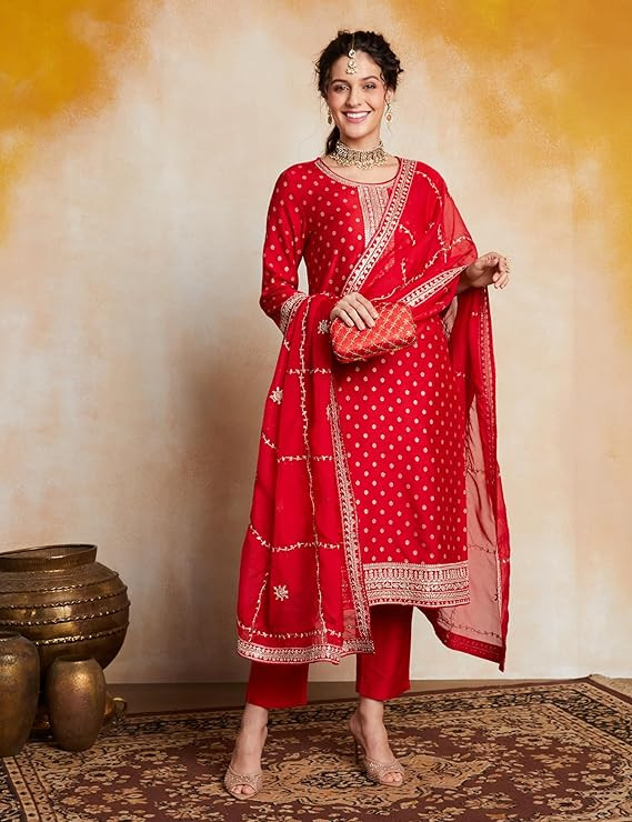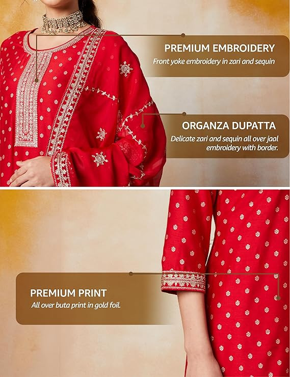 FABRIC: Soft, breathable fabric with excellent drape and subtle shine, designed for all-day comfort and festive elegance. PRODUCT DETAILS: 3-piece set featuring round neck regular fit kurta with 3/4th sleeves, zari embroidery at yoke and cuff, all-over gold khadi print, paired with straight fit pyjama with side pocket and embroidered dupatta. WORKMANSHIP: Crafted with high quality stitching and adorned with premium embellishments, ensuring lasting quality. STYLE TIPS: Pair with with statement jewellery and heels for your special occasions. FIND YOUR PERFECT FIT: Please refer to the 5th image in our catalogue for a detailed size and fit guide. SUSTAINABILITY COMMITMENT: This product is made in a certified factory that is committed to ethical labour practices. We use FSC certified tags and re-cycled packaging.