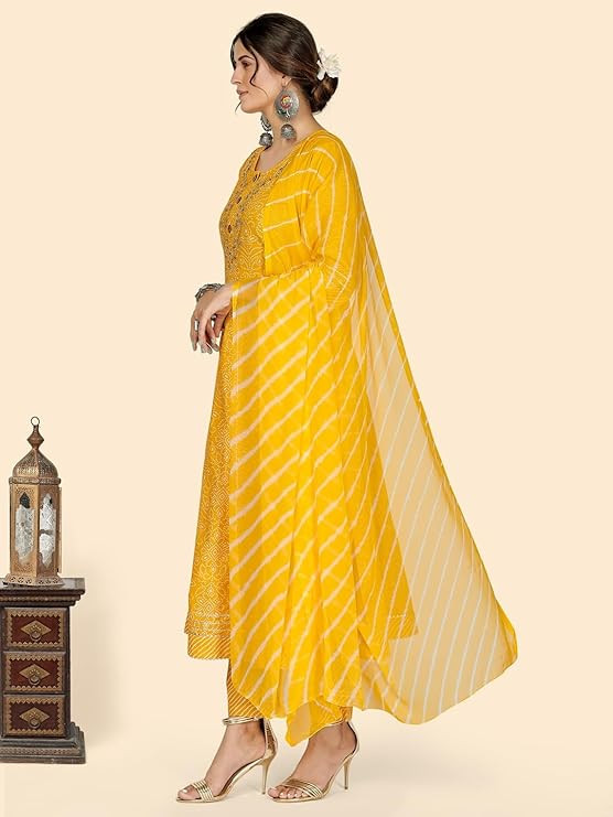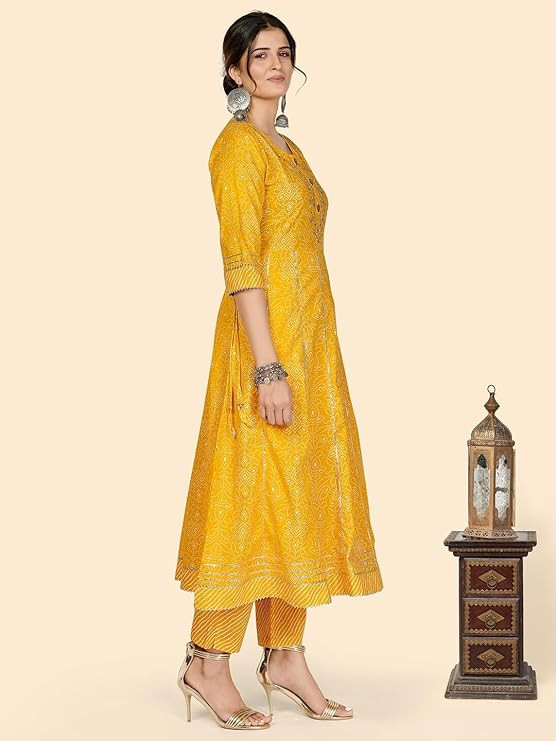 Vibrant Design: The Women's Bandhani & Embroidered Anarkali Cotton Yellow Stitched Kurta Pant With Dupatta set features a stunning Bandhani print and intricate embroidery, creating a vibrant and traditional look. Comfortable Cotton Fabric: Made from high-quality cotton, this set ensures maximum comfort and breathability, making it perfect for all-day wear. Classic Silhouette: The Anarkali kurta with a round neck and 3/4 sleeves offers a timeless and flattering fit, suitable for various body types and occasions. Complete Set: This ensemble includes a stitched Anarkali kurta, matching pants with a convenient pocket, and a coordinating dupatta, providing a cohesive and stylish outfit. Versatile Occasion Wear: Ideal for festive celebrations, family gatherings, and casual outings, this yellow set adds a touch of elegance and sophistication to any event.