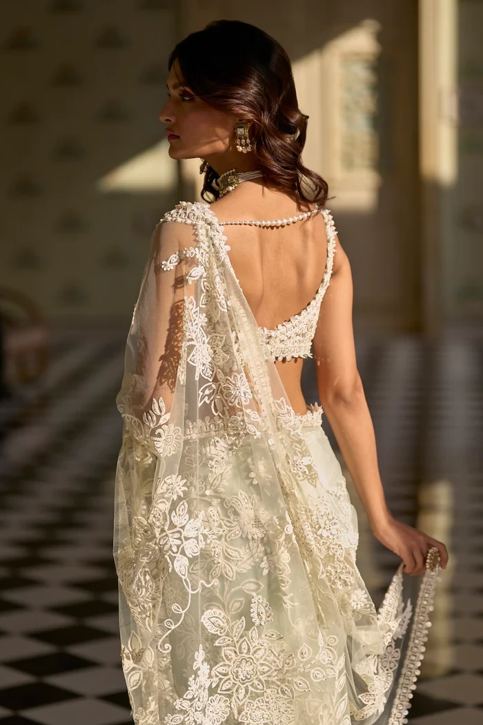 This saree features ivory thread and sequin embroidery on a mint green net base. The embroidered blouse shows plunging neckline with scalloped detailing and tassels on the neck and hem.