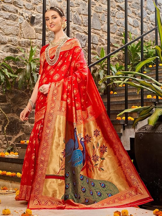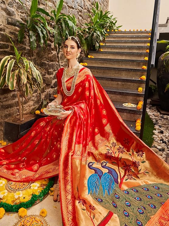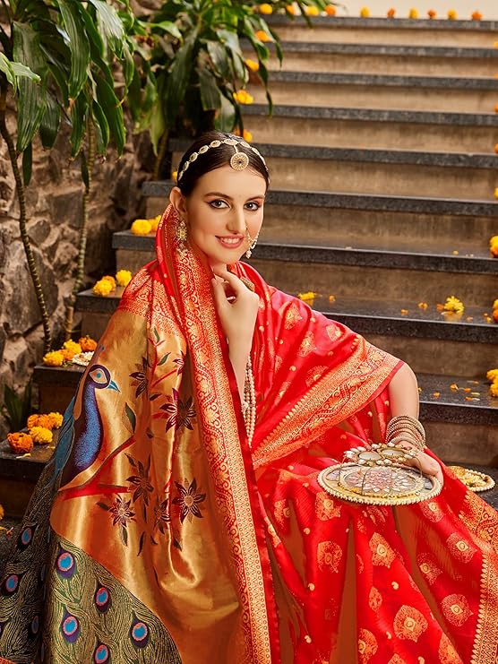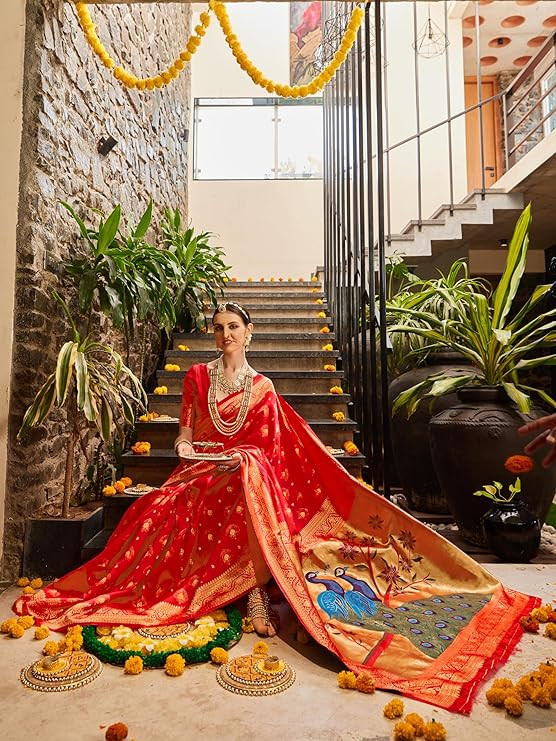 • Saree Details || Saree Fabric :- Silk Blend| Saree Pattern :-Woven Design |Saree Length :- 5.3 Meter | Saree Type :- Paithani | Saree Color : Red