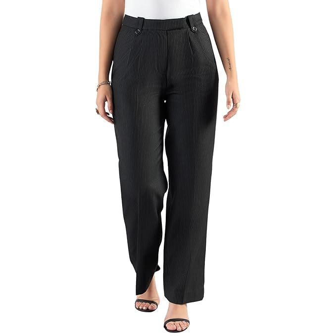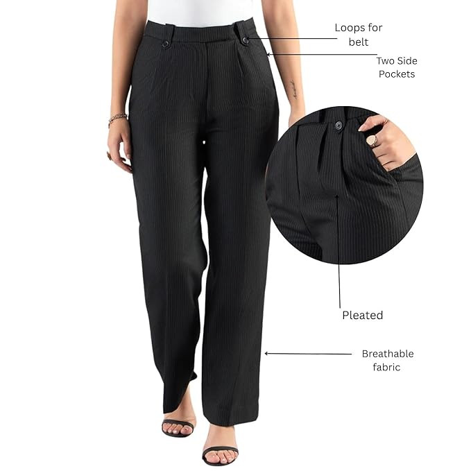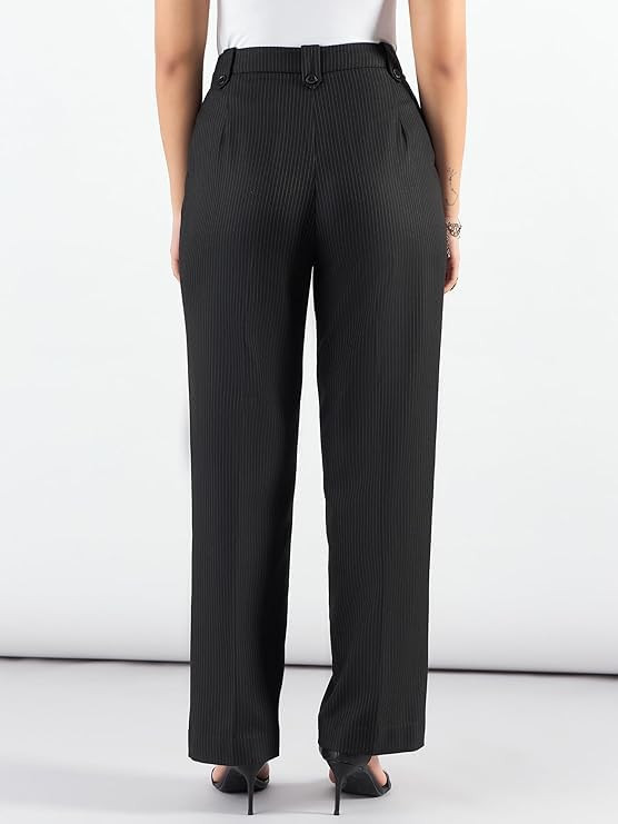 Powersutra Women's Striped High Waist Relaxed Fit Pleated Trouser | Formal Pant | Black |