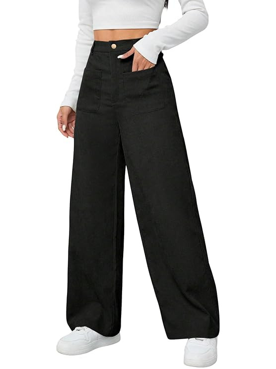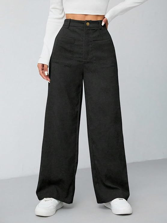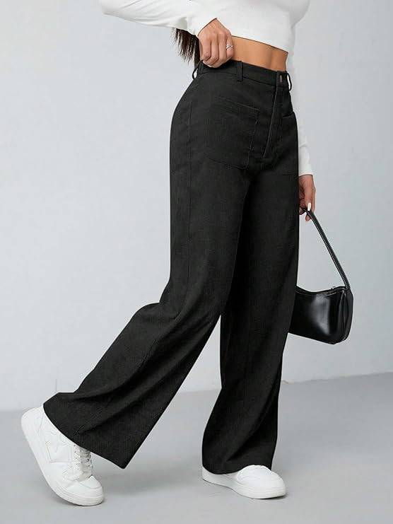 Women's Wide Leg Trousers Pants with Front Patch Pockets | High Waist Flared Bottom Officewear, Casual & Travel Wear Pants, College & Events